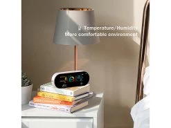 Informiert über Ihr Raumklima: Auf dem großen Farb-Display lesen Sie auch Temperatur und Luftfeuchtigkeit ab. So vermeiden Sie zu trockene oder zu feuchte Luft – und beugen Gefahren wie Infektions-Anfälligkeit oder Schimmelpilzen und Milben vor.
