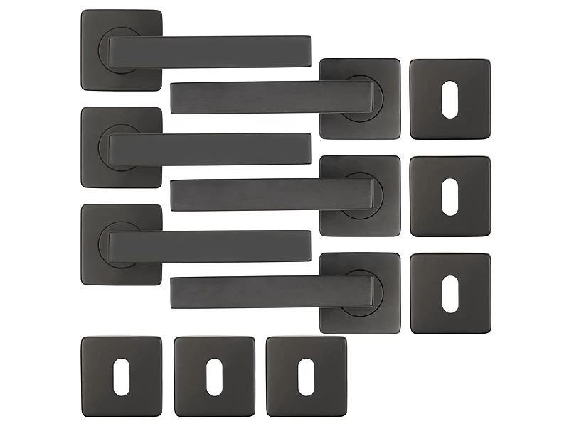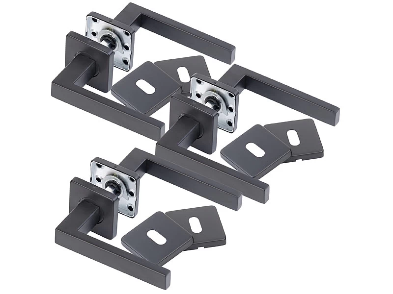 - 3er-Set Türbeschläge in Schwarz jeweils inklusive 2 Türklinken, 2 Rund-Rosetten, Vierkant-Stift, 2 Buntbart-Rosetten, Montage-Material und deutscher Anleitung – Türklinketürgriff – Außerdem relevant oder passend zu: WC