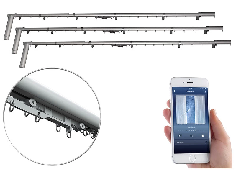 Carlo Milano Smarte Gardinenstange:3er-Set Teleskop-Gardinenstangen Elektr. Antrieb, WLAN&App, 172-306 Cm