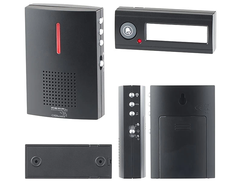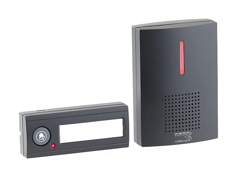 - Maße Türklingel: 90 x 36 x 18 mm, Gewicht: 34 g, Basisstation: 70 x 100 x 30 mm, Gewicht: 76 g (ohne Batterien)