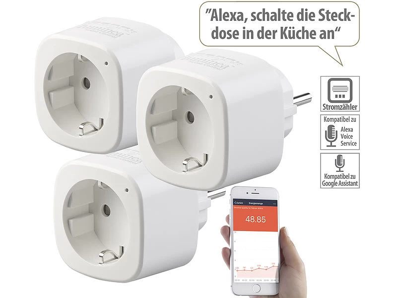 Luminea Home Control 3er-Set WLAN-Steckdosen Mit Energiekostenmesser, App & Sprachsteuerung
