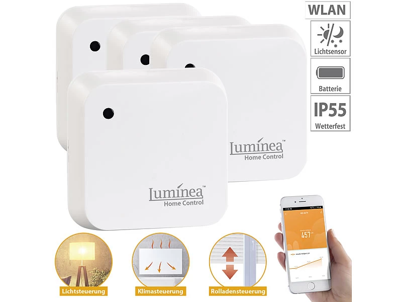 - 4 Helligkeits-Sensoren jeweils inklusive doppelseitigem Klebeband, Montagematerial und deutscher Anleitung – Dämmerungsschalter WLAN – Außerdem relevant oder passend zu: Dimmbare, Schalter, Rolladen, Nachtlicht, Tischlampe, Lichtleiste, Leuchtmittel