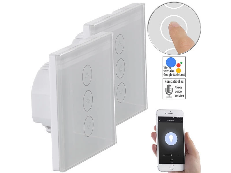 Luminea Home Control Smart Home Lichtschalter:2er-Set Touch-Lichtschalter & Dimmer, Für Alexa & Google Assistant