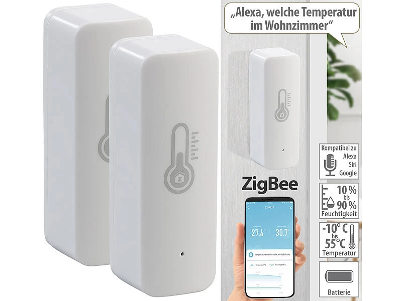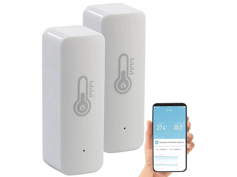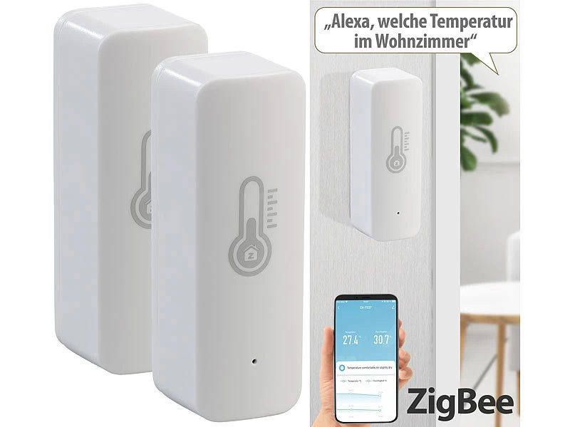 - 2 Temperatur- und Luftfeuchte-Sensoren inklusive deutscher Anleitung – Temperatursensor ZigBee – AuĂźerdem relevant oder passend zu: Wellness, Thermostat, Wetterstation