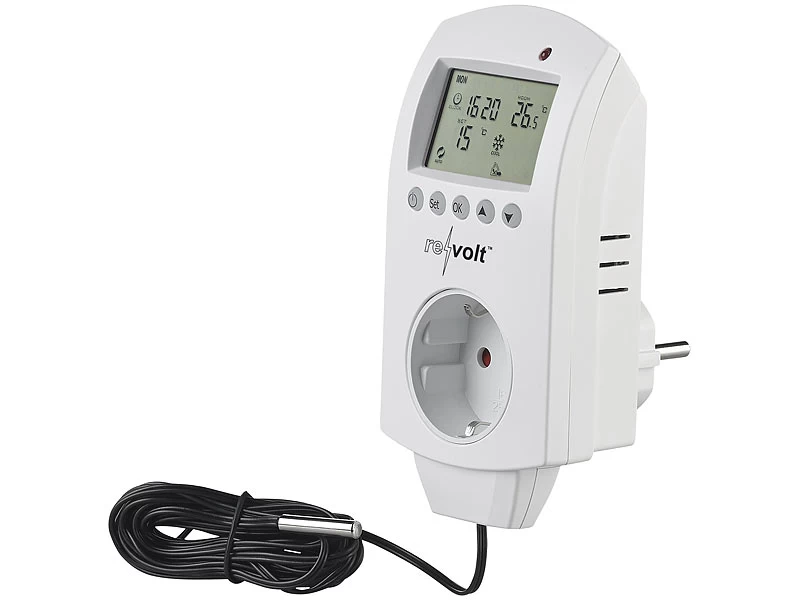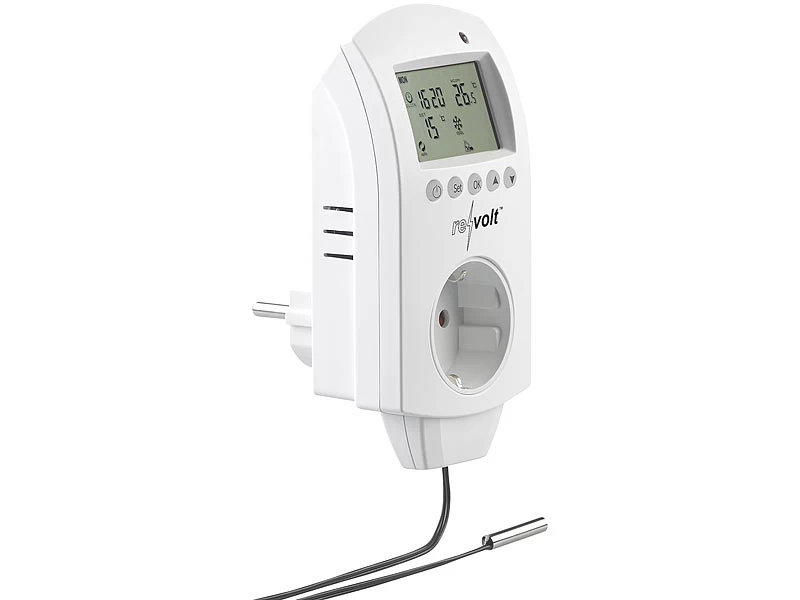 - Zum automatischen, temperaturgesteuertem Schalten von Heizungen und Klimageräten mit Steckdosen-Betrieb