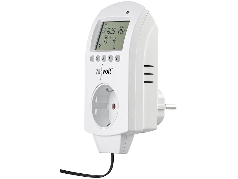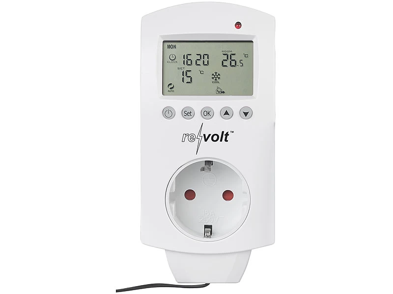 - Zum automatischen, temperaturgesteuertem Schalten von Heizungen und Klimageräten mit Steckdosen-Betrieb