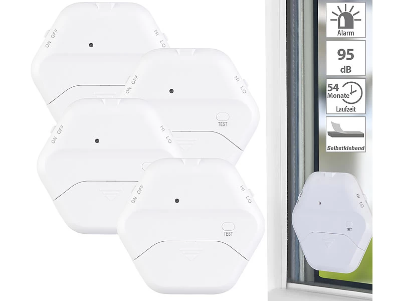 Kinderleichtes Handling: Kleben Sie die Melder im Handumdrehen an Ihre Scheiben. Je ein Klebepad ist auf jedem Melder vormontiert. Stellen Sie noch die Empfindlichkeit ein. Fertig!