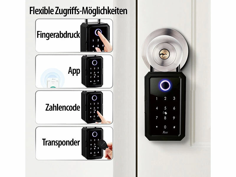 - Flexible Zugriffs-Möglichkeiten: per Zahlencode, Fingerabdruck, Transponder und App